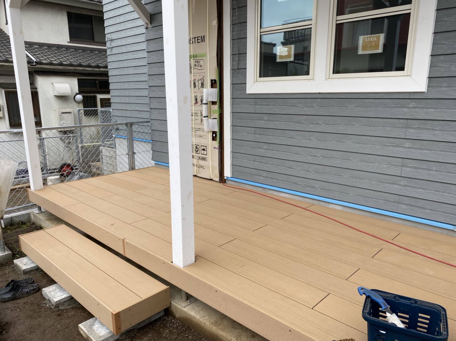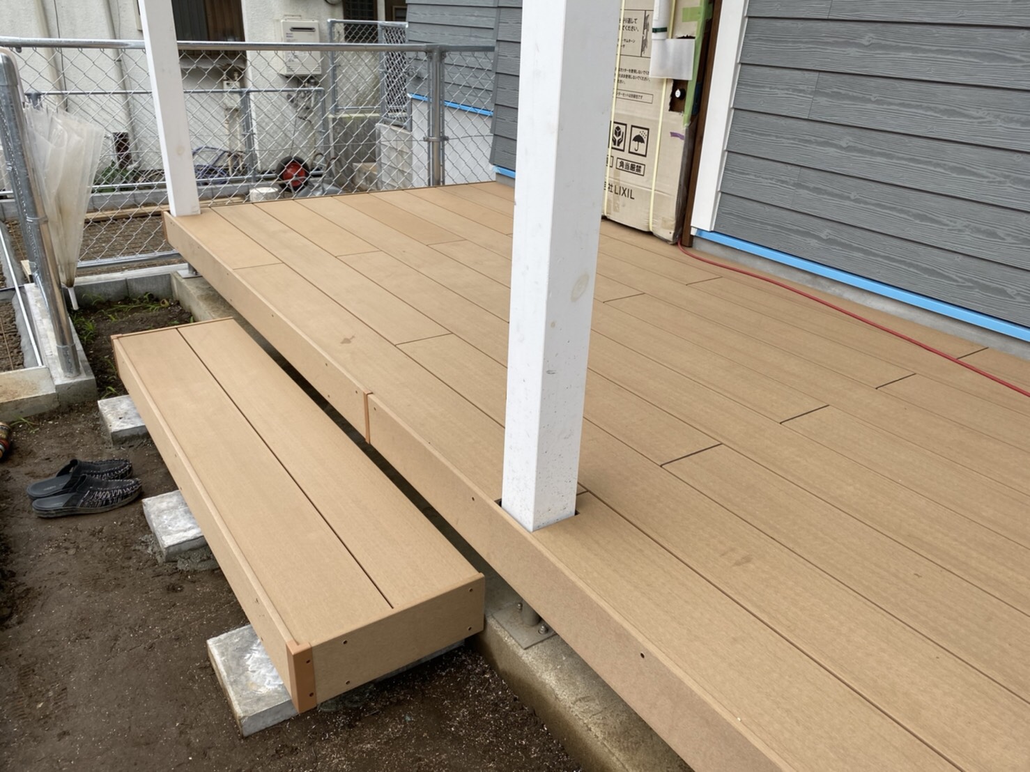 こちらは玄関前とリビングの窓に取り付けたウッドデッキの施工例です。